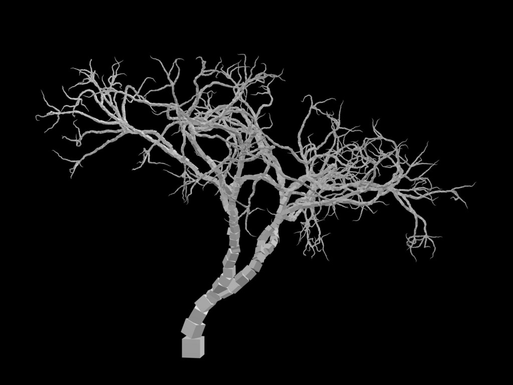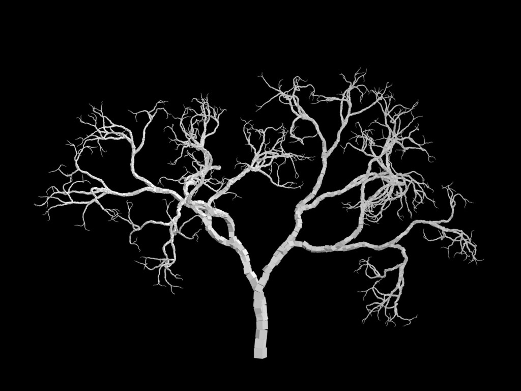 Ces arbres sont des photos d’entités virtuelles. Issues d’algorithmes mathématiques, ces géométries sont constituées uniquement de cubes.