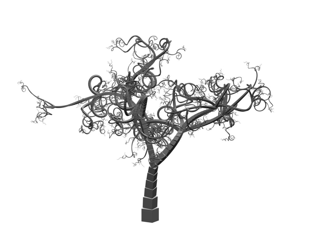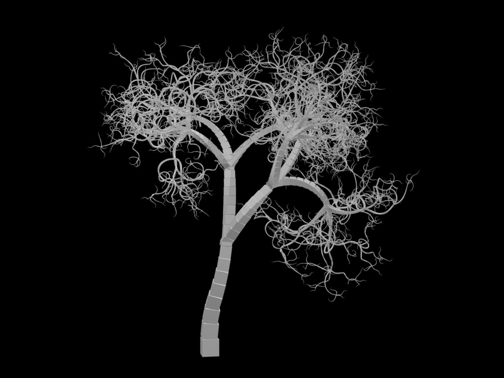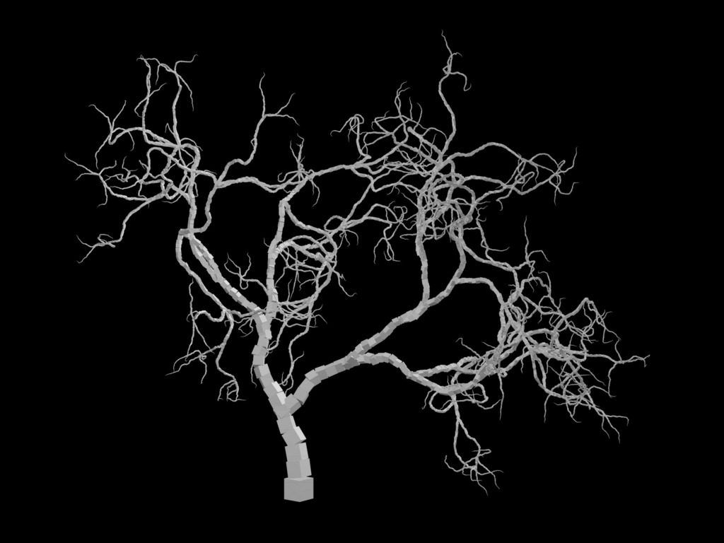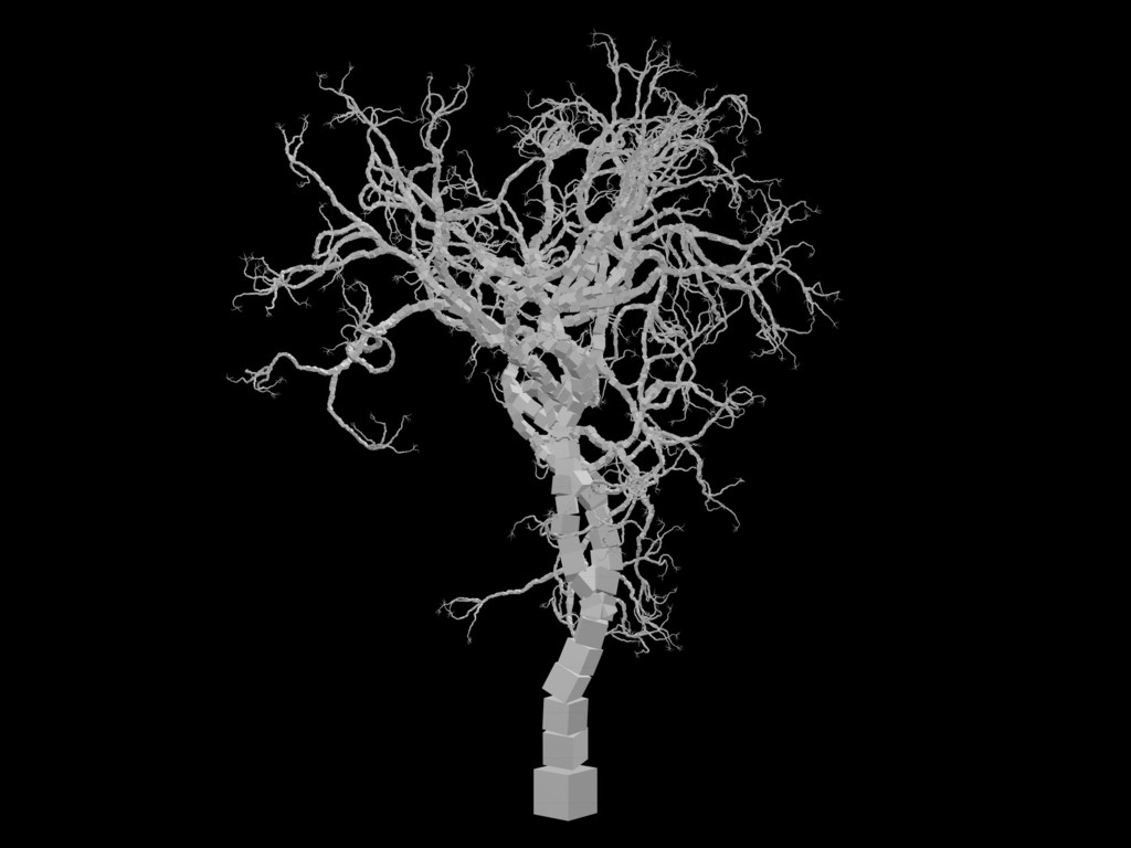Between the simple form of the geometric primitive and the tree's complexity, these images raise questions around the form emergence and the relationship between the virtual and the organic.
