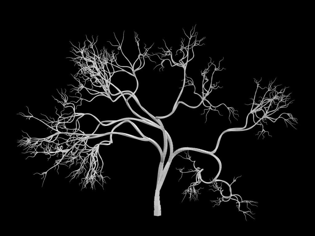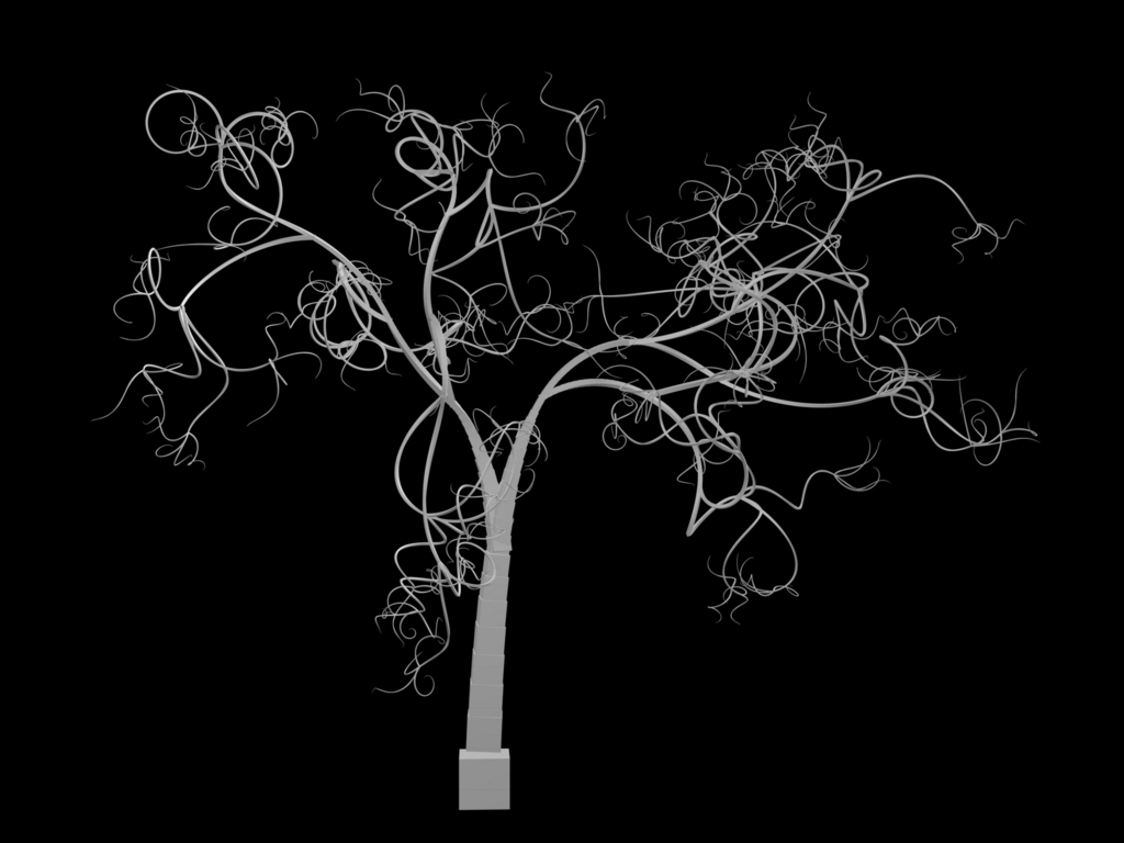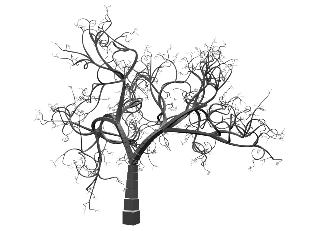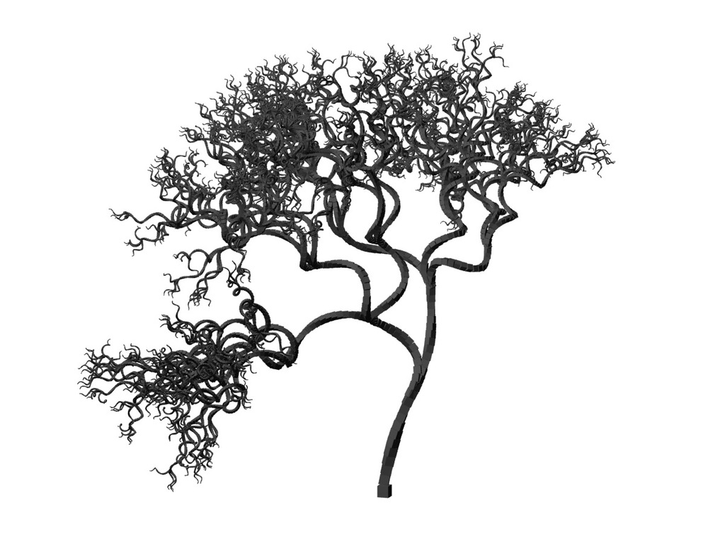 Between the simple form of the geometric primitive and the tree's complexity, these images raise questions around the form emergence and the relationship between the virtual and the organic.