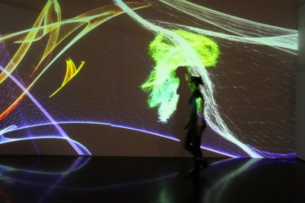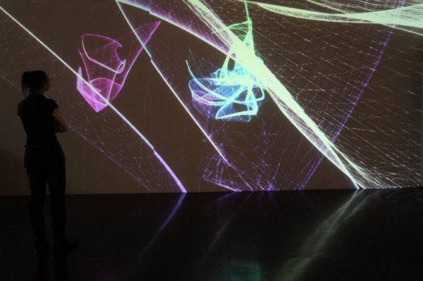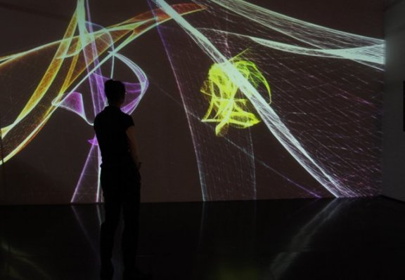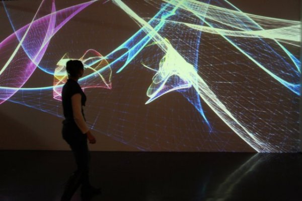 L'univers mathématique des Attracteurs Étranges est transformé en un univers poétique, où les courbes de couleurs dansantes conservent momentanément la trace du passage des spectateurs qui perturbent et parasitent ses courbes.
