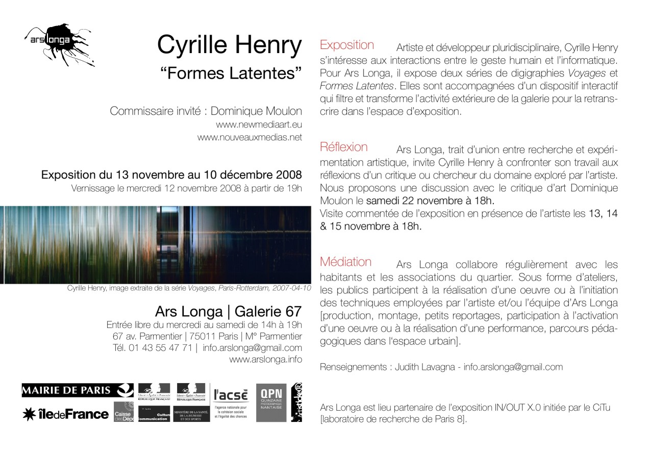 Utilisant le même procédé que pour les Formes Latentes, Cyrille Henry réalisera dans l’espace d’Ars Longa une installation interactive captant l’environnement extérieur de la galerie 24h/24. Les images seront retransmises en temps réel dans l’espace d’exposition. Le promeneur, alors surpris par une transcription de ses propres mouvements, devient tour à tour acteur et spectateur, pouvant se jouer de ses gestes tout en gardant certains repères.