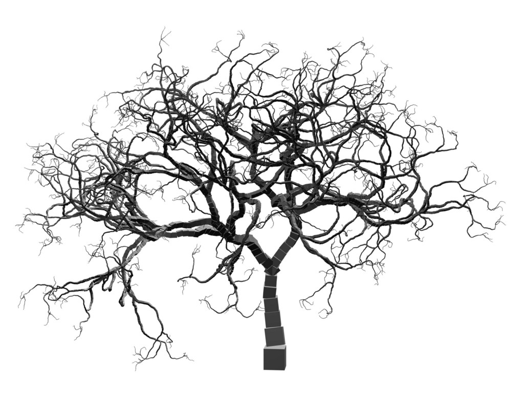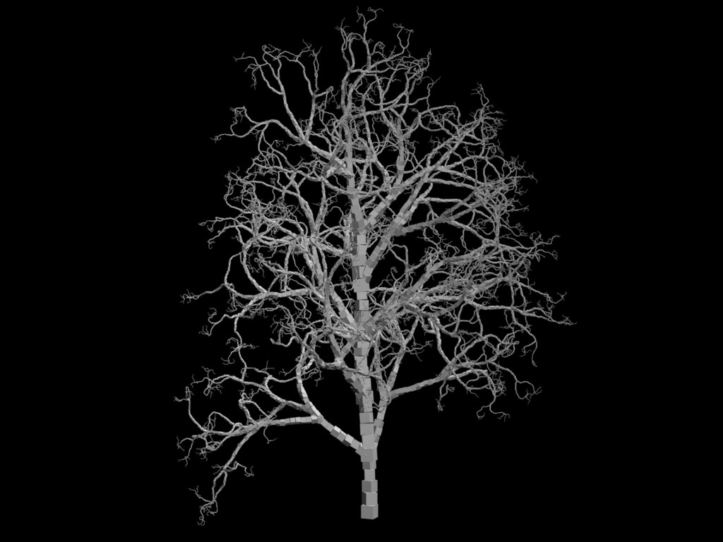 Ces arbres sont des photos d’entités virtuelles. Issues d’algorithmes mathématiques, ces géométries sont constituées uniquement de cubes.