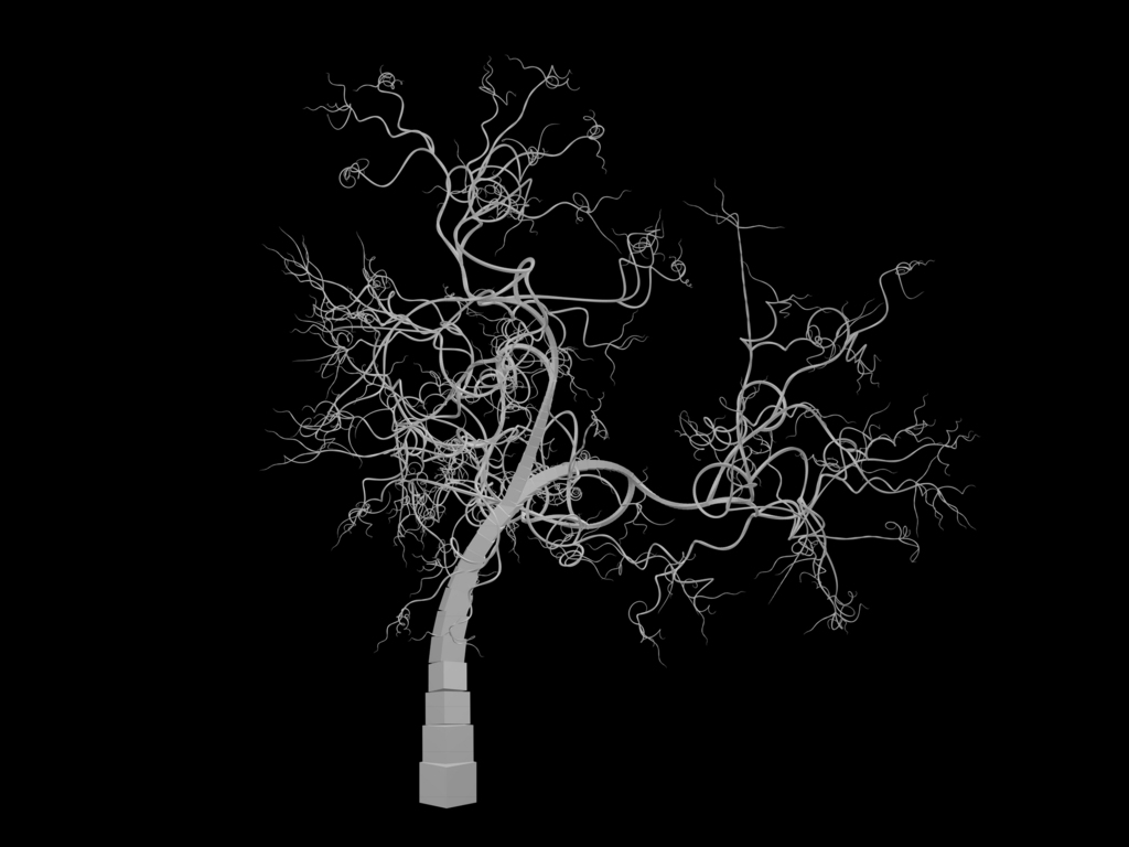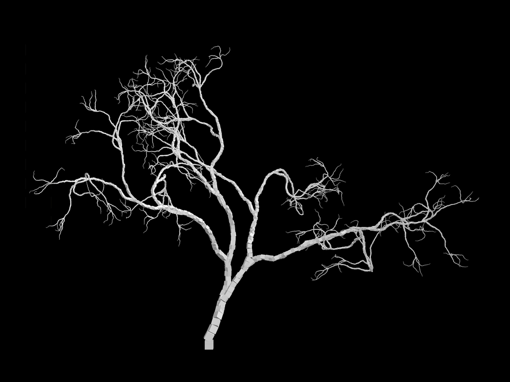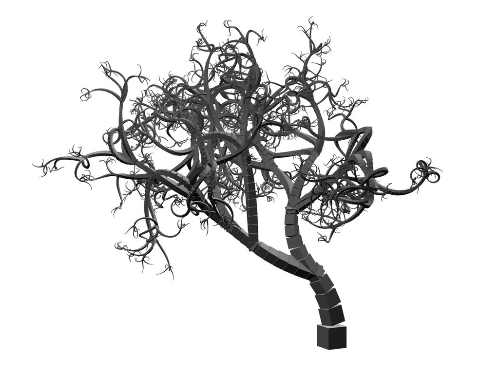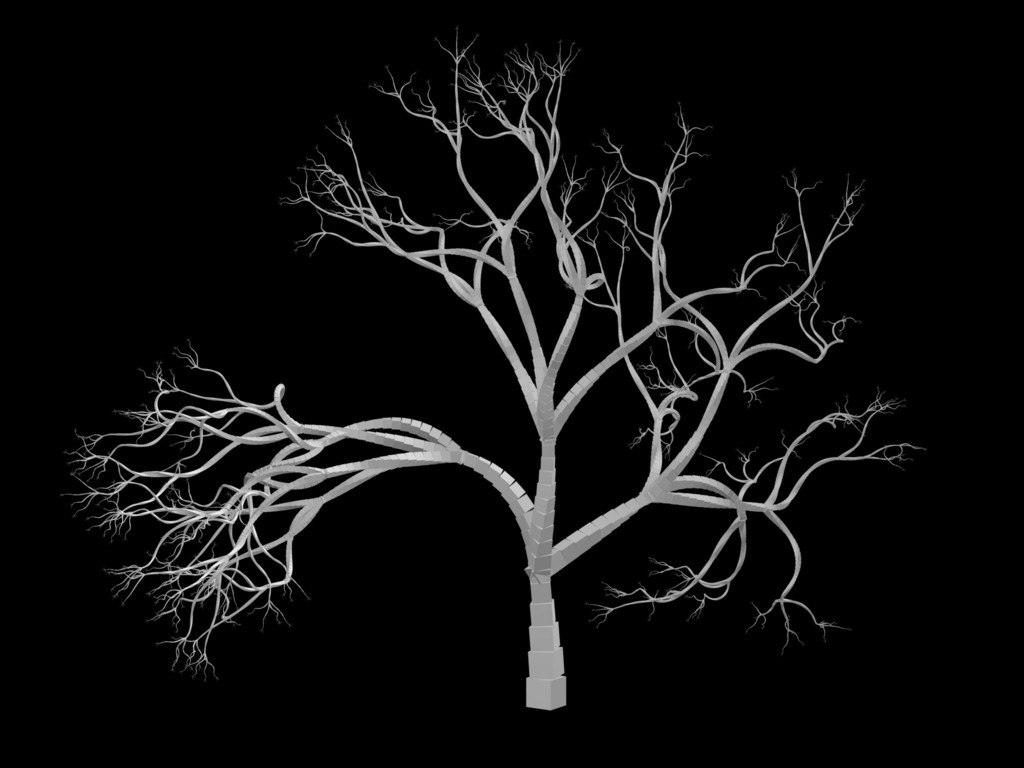 Between the simple form of the geometric primitive and the tree's complexity, these images raise questions around the form emergence and the relationship between the virtual and the organic.