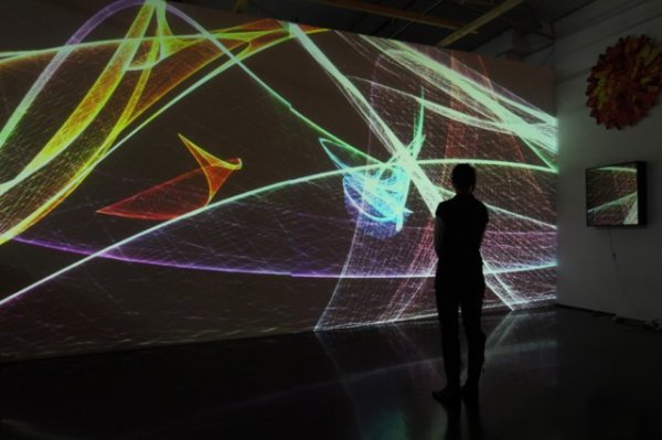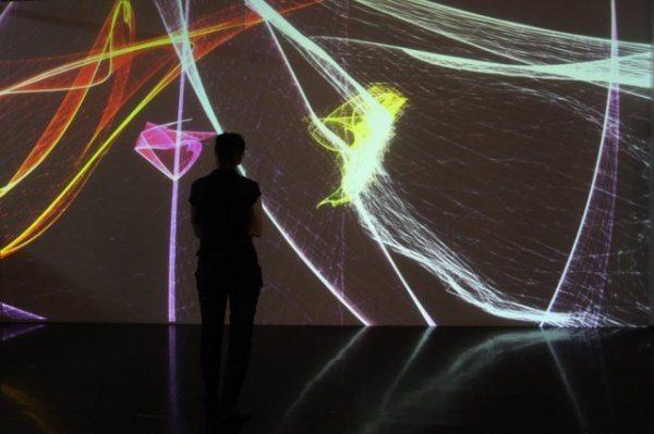 L'univers mathématique des Attracteurs Étranges est transformé en un univers poétique, où les courbes de couleurs dansantes conservent momentanément la trace du passage des spectateurs qui perturbent et parasitent ses courbes.